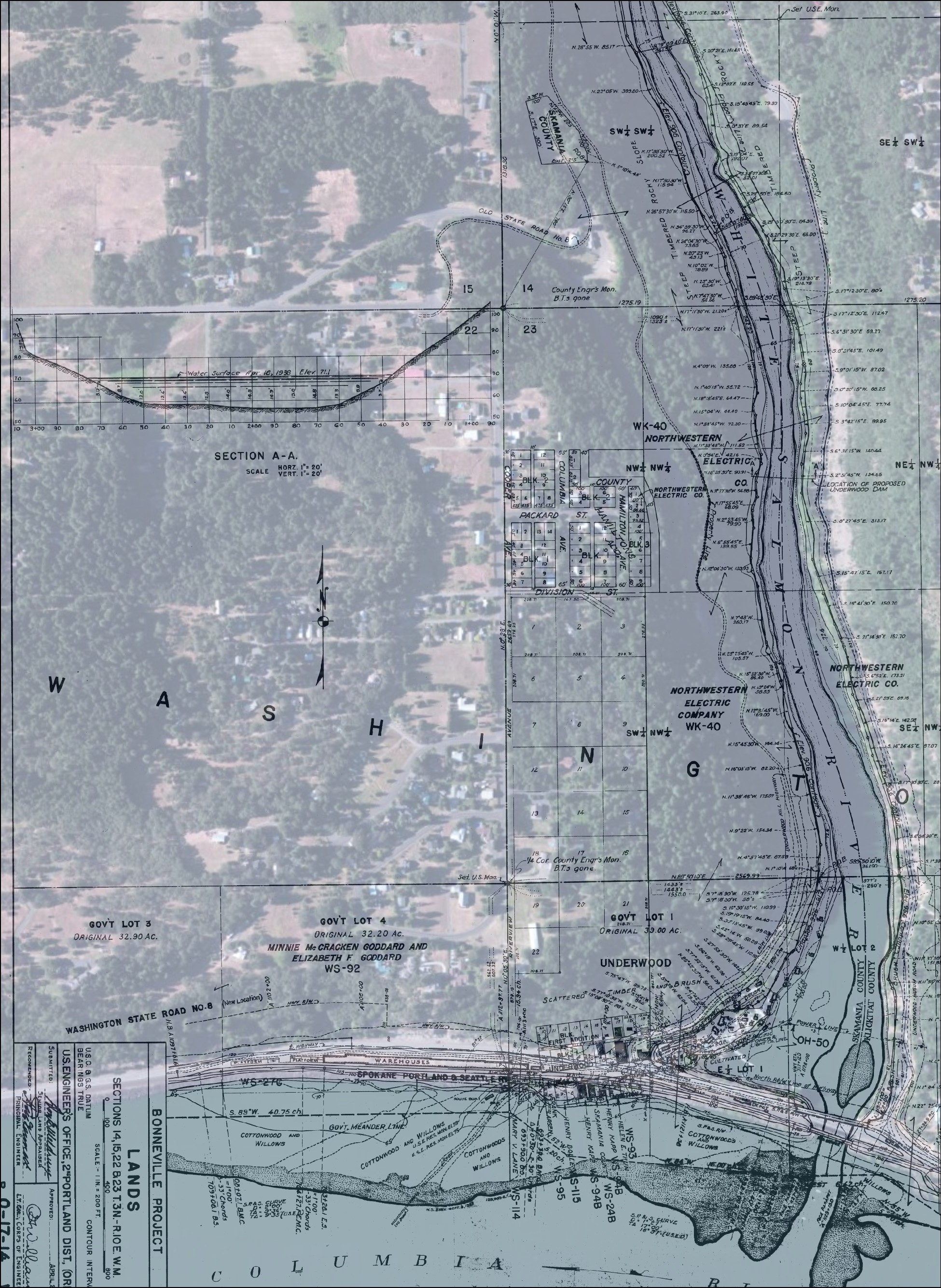 The Underwood community’s economy was historically based on the extensive timberlands, and after the land was cleared, the orchard industry took hold. Before 1908 there was very limited transportation opportunities to this region of the Columbia River Gorge and travel consisted of taking a series of steamboats and portage railways around the rapids that had been in use on both the Oregon and Washington sides of the Columbia River since the 1850s. Regular access to the north side of the Columbia River came with the development of The Spokane, Portland, and Seattle Railway (SP&S) at the turn of the 20th Century, this transportation improved the local agricultural industry. Construction on the North Bank Railroad, as it was initially termed, began in 1906 and officially opened March 11th, 1908. About the same time c1907 construction of the North Bank Highway also termed State Road No 8 began with later sections completed by 1916. This road follows present day Cook-Underwood Road north of the river up on the terrace, it was rerouted closer to the river over different time spans beginning in the 1930s with the planning for the Bonneville hydroelectric dam. The dam was planned to produce 500,000 kwh of power which in turn attracted aluminum processing plants to the Southwest Washington region during World War II and ultimately led to increased industrial development within the river’s settlements. The backwater from the installation of dam in 1934, caused the river to rise some 64 feet behind the structure. Shown is the original 1936 USACOE Survey Map overlaid onto a modern aerial used for HGIS analysis (Frazier 2020).